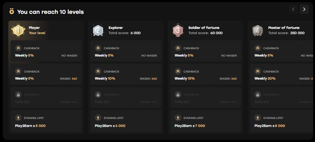 - Cashback: Get back a part of your losses through our cashback program, which provides a financial safety net and gives a new chance to play. The cashback percentage varies depending on your VIP level.